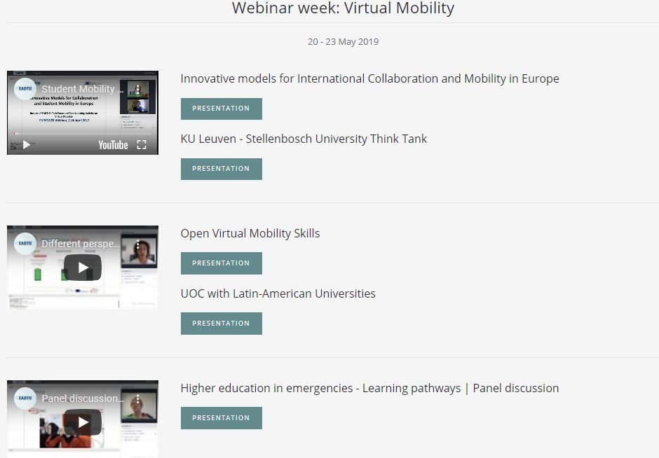 The Virtual Mobility webinar week was a grand success. It started off with a key-note presentation on Innovative models for International Collaboration and Mobility in Europe, looking into the new developments in higher education and international collaboration, using new modes of teaching and learning. This was followed by various Virtual Mobility initiatives. The Open Virtual Mobility skills were explained and the webinar week was rounded up with a panel discussion.